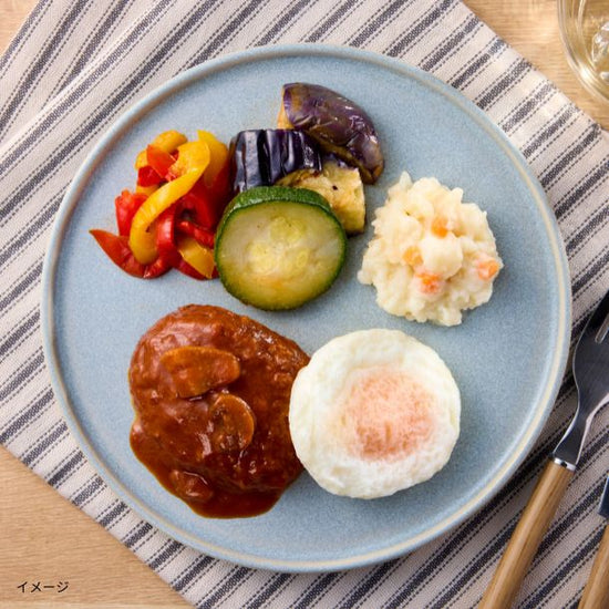 メニュー:デミハンバーグ+目玉焼き風オムレツ、グリルズッキーニ、なす、パプリカ、ポテトサラダ