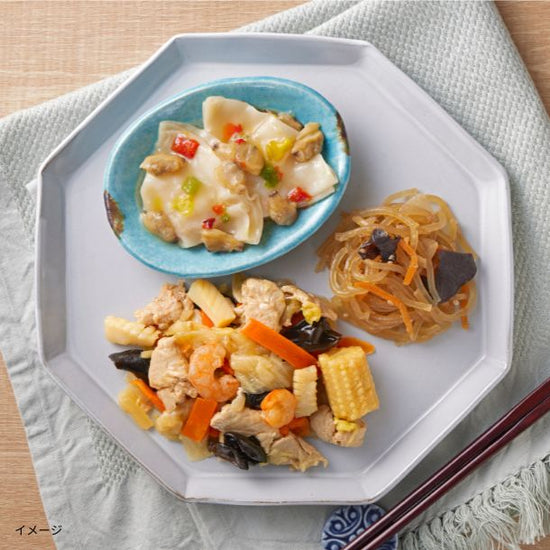 メニュー:八宝菜、ワンタン+ブロッコリーのカラフルあんかけ、チャプチェ