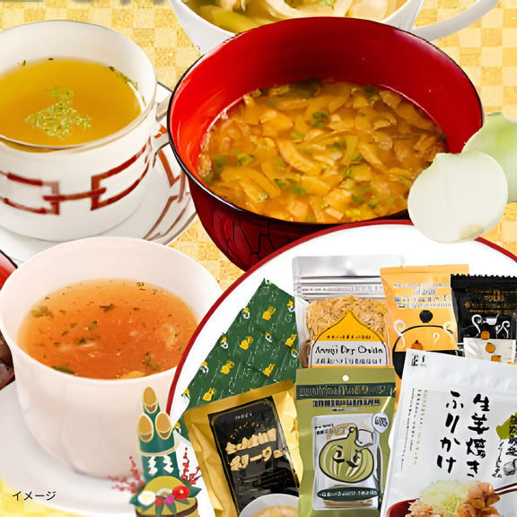 | 内容量 | 淡路島産フルーツたまねぎスープ:150cc×30食、生姜焼きふりかけ:22g×1袋、金のポタージュ:18.7g×2食、淡路島朝のオニオンスープ:7g×1食、朝の玉ねぎみそ汁:9.4g×1食、金のたまねぎポタージュ:150g×1袋、乾燥たまねぎ:30g/セット |