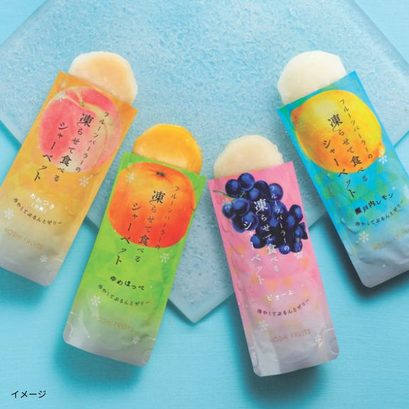 | 原材料名 | 【あかつき】ももピューレ(もも(福島県産))、砂糖、レモン果汁、寒天/ゲル化剤(増粘多糖類)、酸味料、酸化防止剤(V.C)、乳化剤、(一部にももを含む) 【瀬戸内レモン】レモン果汁(レモン(瀬戸内産))、砂糖、寒天/ゲル化剤(増粘多糖類)、乳化剤 【ゆめほっぺ】みかん果汁(せとみ(山口県周防大島産))、砂糖、レモン 果汁、寒天/ゲル化剤(増粘多糖類)、乳化剤 【ピオーネ】ぶどうピューレ(ぶどう(国産)、砂糖)、砂糖、レモン果汁、寒天/ゲル化剤(増粘多糖類)、香料、酸味料、乳化剤 |