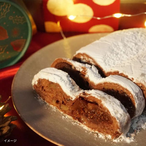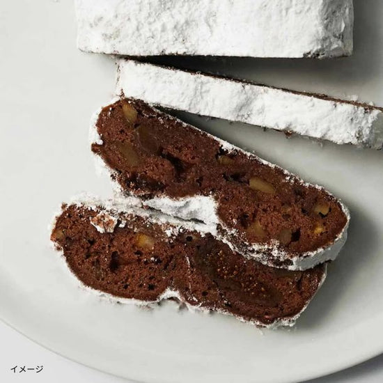 | 原材料名 | 小⻨粉(国内製造)、バター、ドライフィグ、牛乳、オレンジの砂糖漬け、チョコレート(カカオ豆、きび糖)、きび糖、レーズン、くるみ、粉糖、卵、カカオニブ、食塩、赤ワイン、ラム酒、コアントロー、レモン、シナモン、アニス、クローブ/パン酵母(乳化剤、V.C)、(一部に、小麦、乳成分、くるみ、卵、オレンジを含む) (外側コーティング:バター、ニブシュガー) ※本商品にはアルコールが含まれています。 |