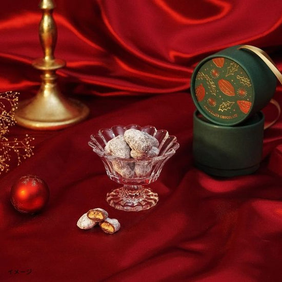 香ばしいピーカンナッツを、カカオ70%のチョコレートで包み、粉糖をまぶしてやさしい味わいに仕上げました。まろやかな甘さとナッツの香ばしさが広がる、クリスマスにぴったりの一品です。