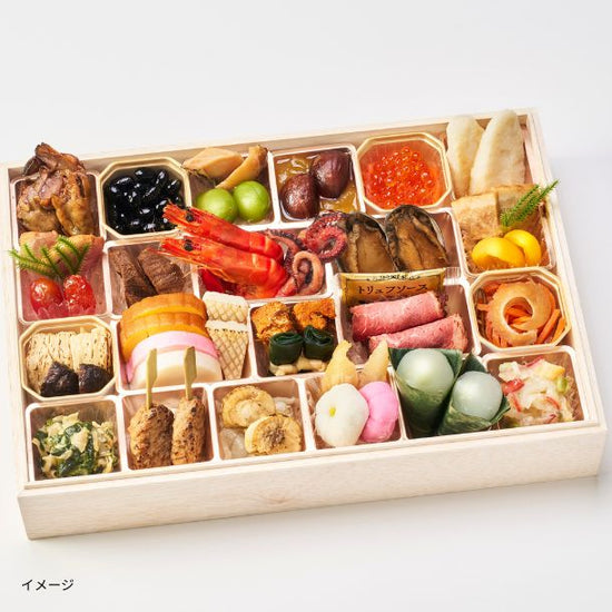 牡蠣佃煮、黒豆煮、真鯛幽庵焼、若桃甘露煮、きんとん、渋皮栗甘露煮、味付いくら、紅白なます、笹蒲鉾、合鴨スモーク、ドライトマト赤ワイン煮、牛たん角煮、海老の旨煮、たこ煮付、あわび煮、煮豚、杏子煮、焼湯葉煮、椎茸煮、伊達巻、紅蒲鉾、白蒲鉾、いか白焼、鱈子煮、昆布巻、ローストビーフ(ソース別添)、味付フカヒレ、いか人参、帆立ひもと菜の花からし和え、焼つくね串、帆立香草焼、オニオンマリネ、味付数の子、梅花餅(白)、梅花餅(紅)、笹巻ずんだ葛餅、ホッキわさびサラダ