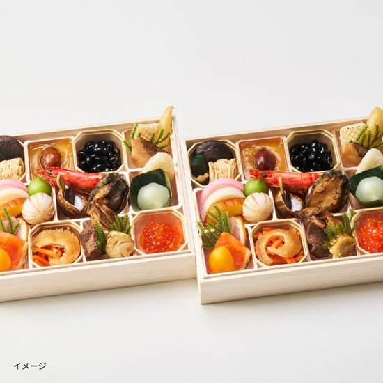 椎茸煮、昆布巻、焼湯葉煮、きんとん、渋皮栗甘露煮、黒豆煮、いか白焼、味付数の子、真鯛幽庵焼、紅蒲鉾、白蒲鉾、伊達巻、若桃甘露煮、手まり餅、海老の旨煮、バイ貝甘煮、あわび煮、笹蒲鉾、笹巻ずんだ葛餅、合鴨スモーク、スモークサーモントラウト、杏子煮、いか人参、味付フカヒレ、牡蠣佃煮、牛たん角煮、帆立香草焼、味付いくら、紅白なます