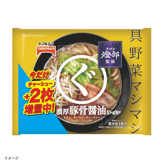 名店「ラーメン燈郎」監修のこだわりの具材(豚チャーシュー、キャベツ、もやし)をトッピングしました。 鶏ガラと豚ガラを使用した濃厚な豚骨醤油スープとともにお楽しみください