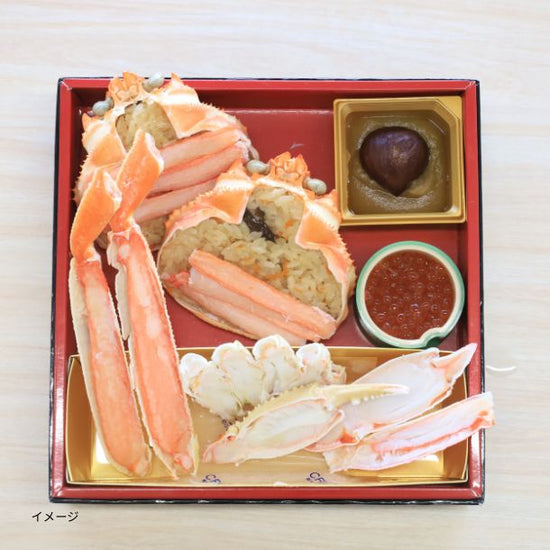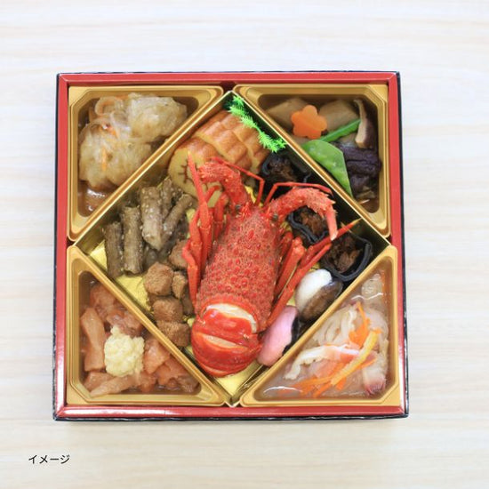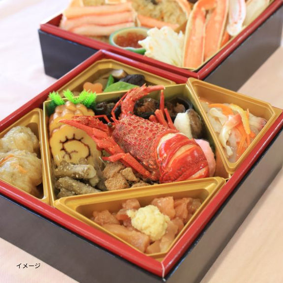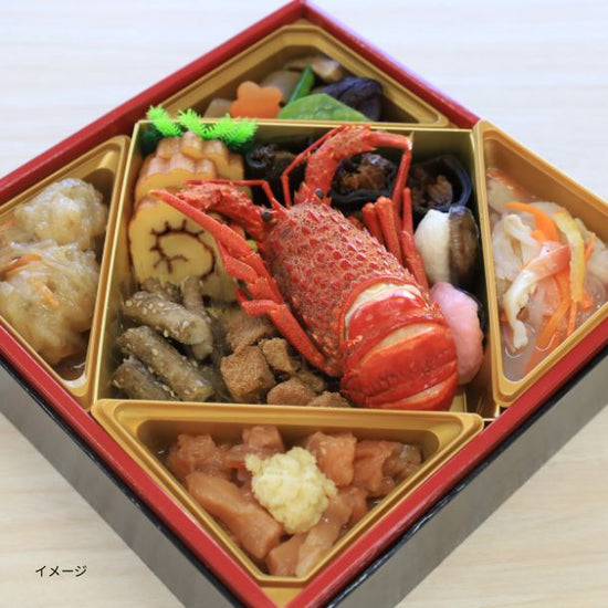 お重の主役は、鮮やかな赤色がめでたい「ボイルロブスター」。さらに、食べごたえのある「ずわいがにビードロ(脚肉)」と、旨味が染み込んだ「紅ずわいがにおこわ」も入り、甲殻類好きにはたまらない贅沢な構成です。