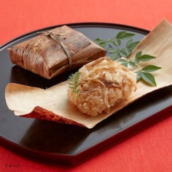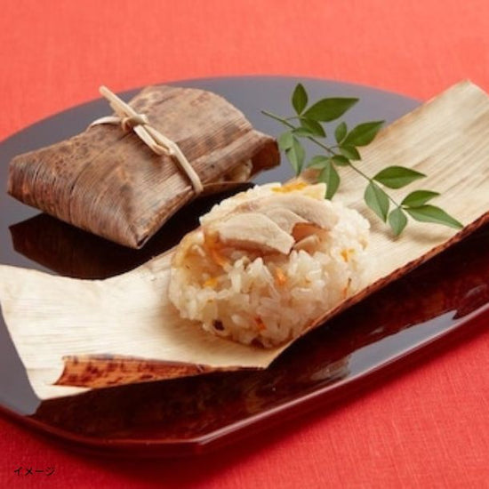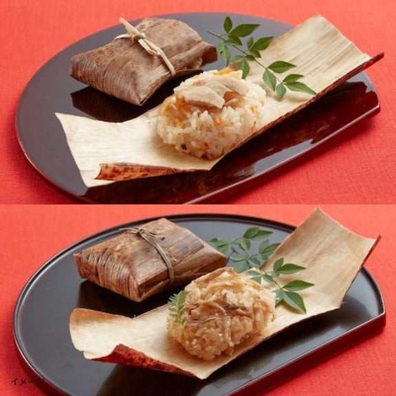 こしが強くふっくらとしたおこわの舞茸、鶏の2種の食べ比べをお楽しみください。竹皮のまま加熱してお召し上がりいただけます。