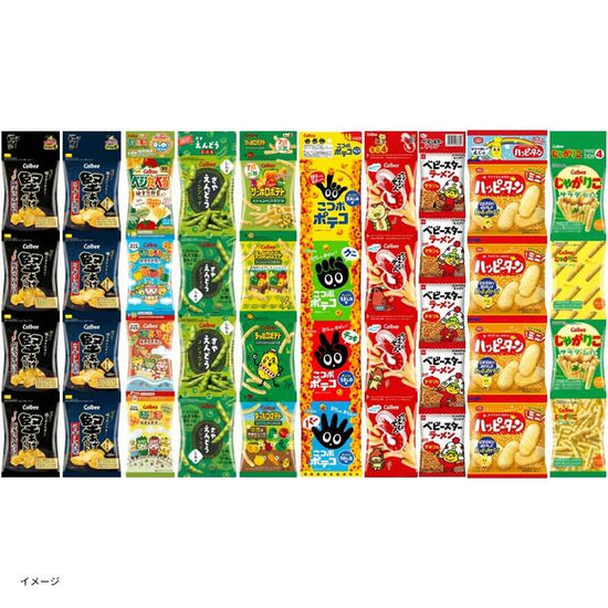 内容量 じゃがりこサラダ味:14g×4袋、ハッピーターン:15g×4袋、ベビースターラーメン:19g×4袋、かっぱえびせん:12g×5袋、こつぶポテコ:14g×4袋、さやえんどう:12g×4袋、サッポロポテトつぶつぶベジタブル:10g×4袋、堅あげポテトうすしお味:15g×4袋、堅あげポテトブラックペッパー:15g×4袋/箱